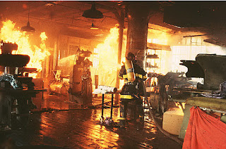 -Donald "Shadow" Rimgale(Robert De Niro) is an arson investigator dedicated to his job. He get called in for a number of fires set recently that appear connected to an arsonist named Ronald Bartel(Donald Sutherland), who has been in prison for years. He appears normal on occasions, but at the mention of a fire, he gets obsessed with the idea of fire living and breathing. Rimgale manipulates this to ensure Ronald's annual application for parole is denied. Brian consults Ronald for advice on the missing link in the recent arsons. The longest servinf of all the firefighters, John "Axe" Adcox(Scott Glenn) served under the McCaffrey's father in the Chicago Fire Department and was like an uncle to the 2 boys. He's a hard worker, takes pride in his work, and loves the department. He attacks the fires head on, but is concerned about Stephen's unusual methods for fighting the fires and safety measures. When 17 gets a call about a high rise fire, Stephen says move quickly despite Adcox's advice to wait for backup. Brian's friend and fellow "probationary fireman" trainee Tim Krizminski(Jason Gedrick), under Stephen's care, accidentally opens a door only to have a backdraft greet him face on. His face is severly burned beyond recognition, but he survives. Adcox and Brian both blame Tim's condition on Stephen's recklessness.